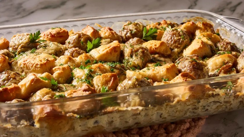 A big plate of rich, creamy beef stroganoff is tempting, but the prep and cleanup can be overwhelming on a busy weeknight. This recipe delivers the same satisfying flavors with less effort! Our bubble-up bake features a tangy mushroom cream base, juicy beef meatballs, and the convenience of Pillsbury™ Grands!™ Biscuits instead of noodles to soak up the sauce. Let your oven do the heavy lifting; you deserve the extra time and one of our best casserole recipes in your dinner rotation.
