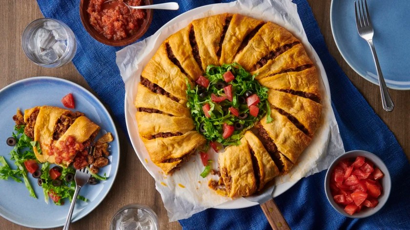 This genius 5-star recipe is one of the most popular recipes on Pillsbury.com because it’s fun and easy to make. All you need is ground beef seasoned with Old El Paso™ taco seasoning mixed with yummy cheese. Then just tuck it all inside a ring of flaky, tender, crescent rolls. Surprise your family by serving it for a weeknight dinner. It might just become one of those dishes on your regular rotation. Or impress your guests by serving this taco crescent ring recipe for the big game. Offer a several toppings with it, and you have yourself a simple top-your-own taco bar, they will rave about.