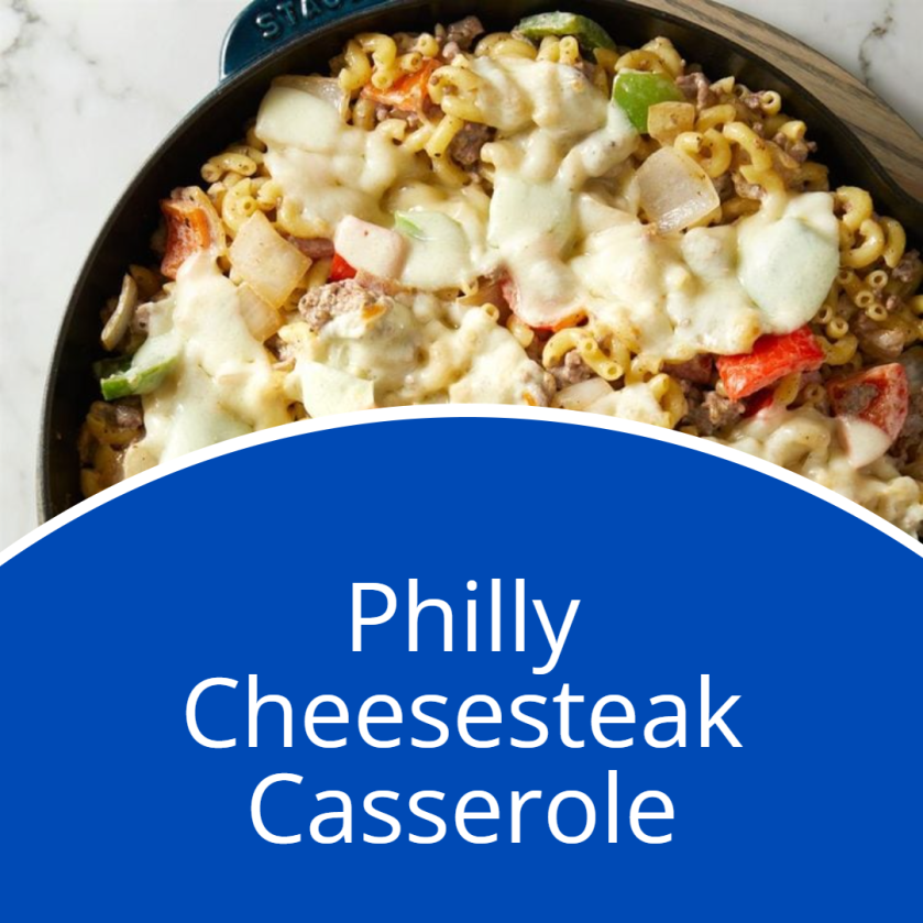 Nothing says comfort food like a casserole—and this Philly cheesesteak casserole recipe is definitely comfort food. With macaroni, ground beef, peppers, onions, a provolone cheese topping and a creamy sauce that holds everything together, this recipe has all the great flavors of a Philly cheesesteak transformed into one hearty make-ahead meal. Prep the bake for busy evenings when you don’t have time to linger in the kitchen, or share it with a friend who needs some home-cooked comfort food.
